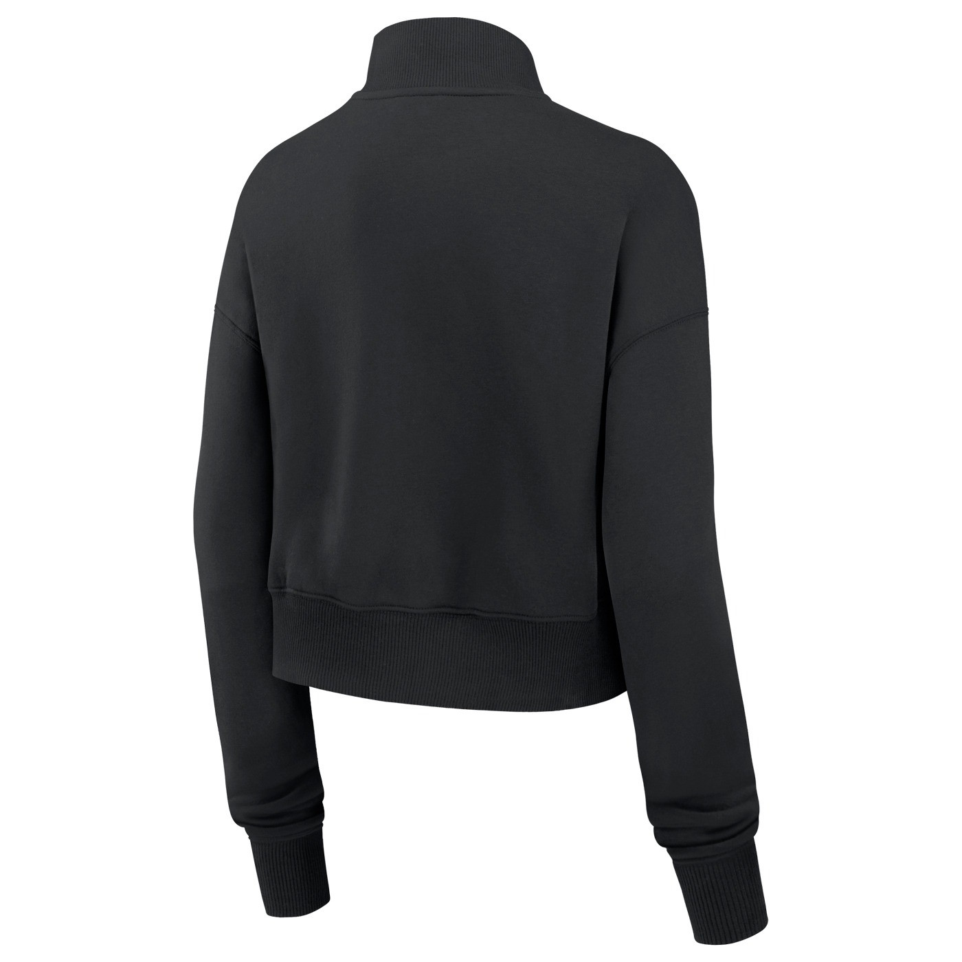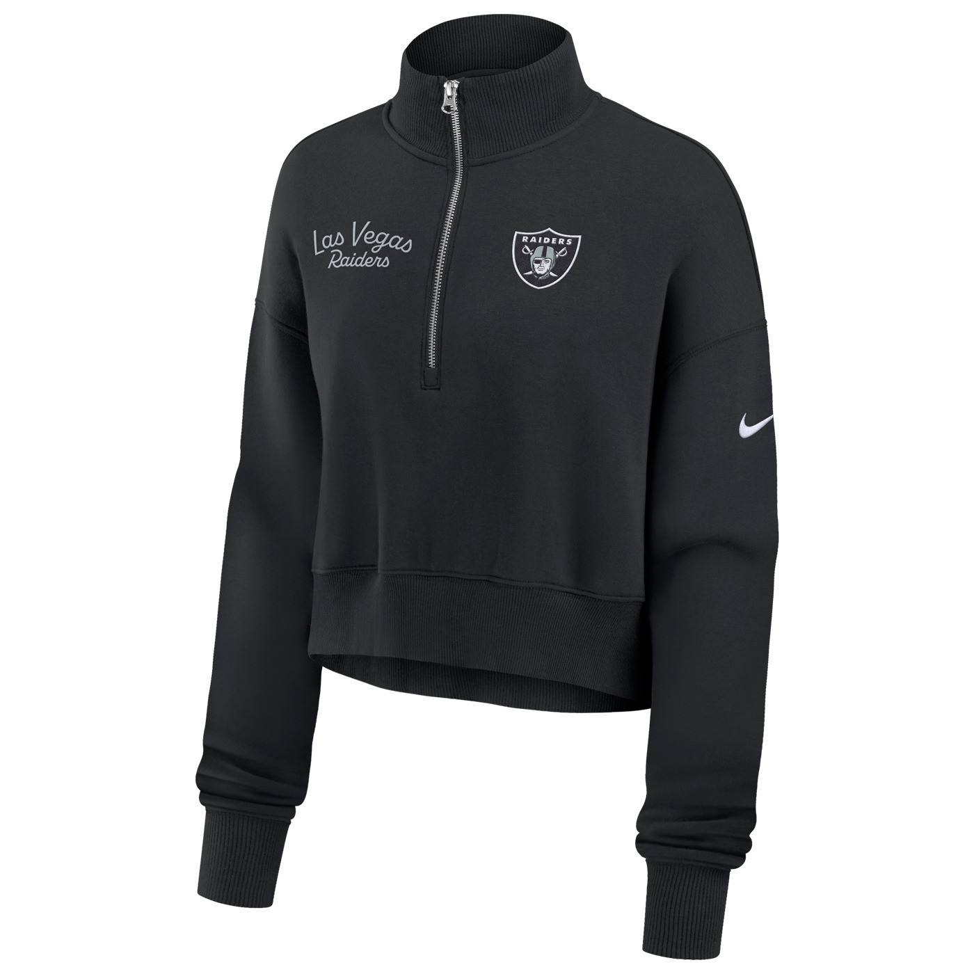 Stay warm and stylish in the Nike Women's Phoenix Quarter Zip Pullover. This cropped layer features a ribbed collar, cuffs, and waistband for a snug fit, with Las Vegas Raiders script and a team shield logo printed on the chest to show off your fandom. 82% cotton, 18% polyester.