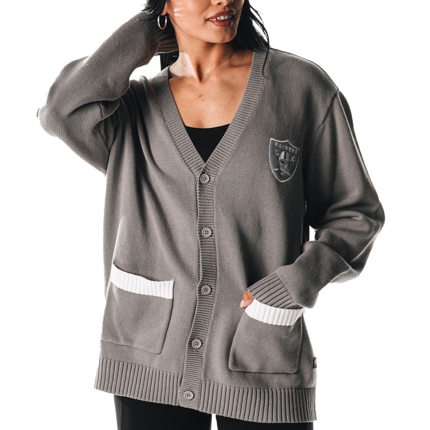 Raiders fandom meets classic style in this Unisex Raiders Gray Jacquard Sweater by The Wild Collective. Designed with premium jacquard knit fabric, this V-neck cardigan offers a comfortable fit with ribbed cuffs and hem. The button-up closure and side pockets provide everyday versatility, while the embroidered team shield logo on the front and woven Las Vegas Raiders and team pirate logo on the back ensure your allegiance stands out. 100% cotton.
