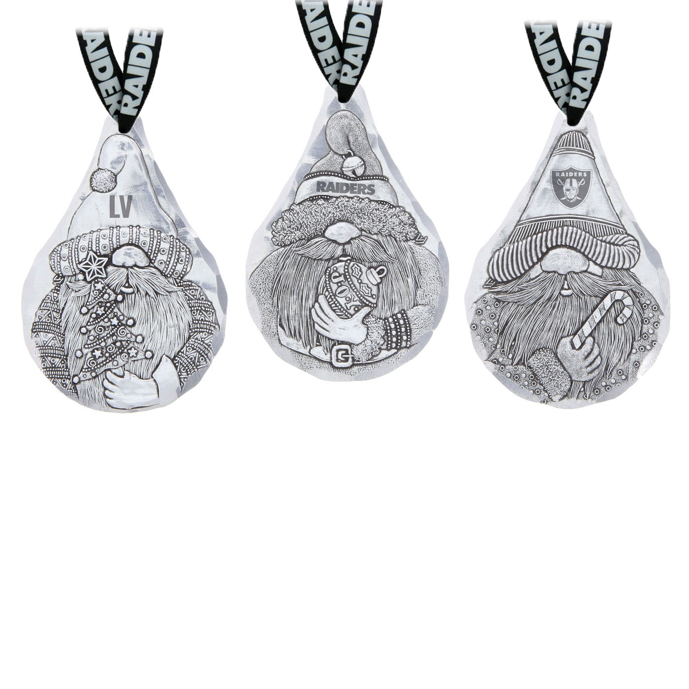 Deck the halls with team pride with the Raiders 3 Piece Gnomes Ornament Set by Wendell August Forge. These handcrafted ornaments showcase playful gnomes in holiday garb adorned with the team shield and wordmark logos. 100% aluminum. Measures approximately 2.5" x 3".