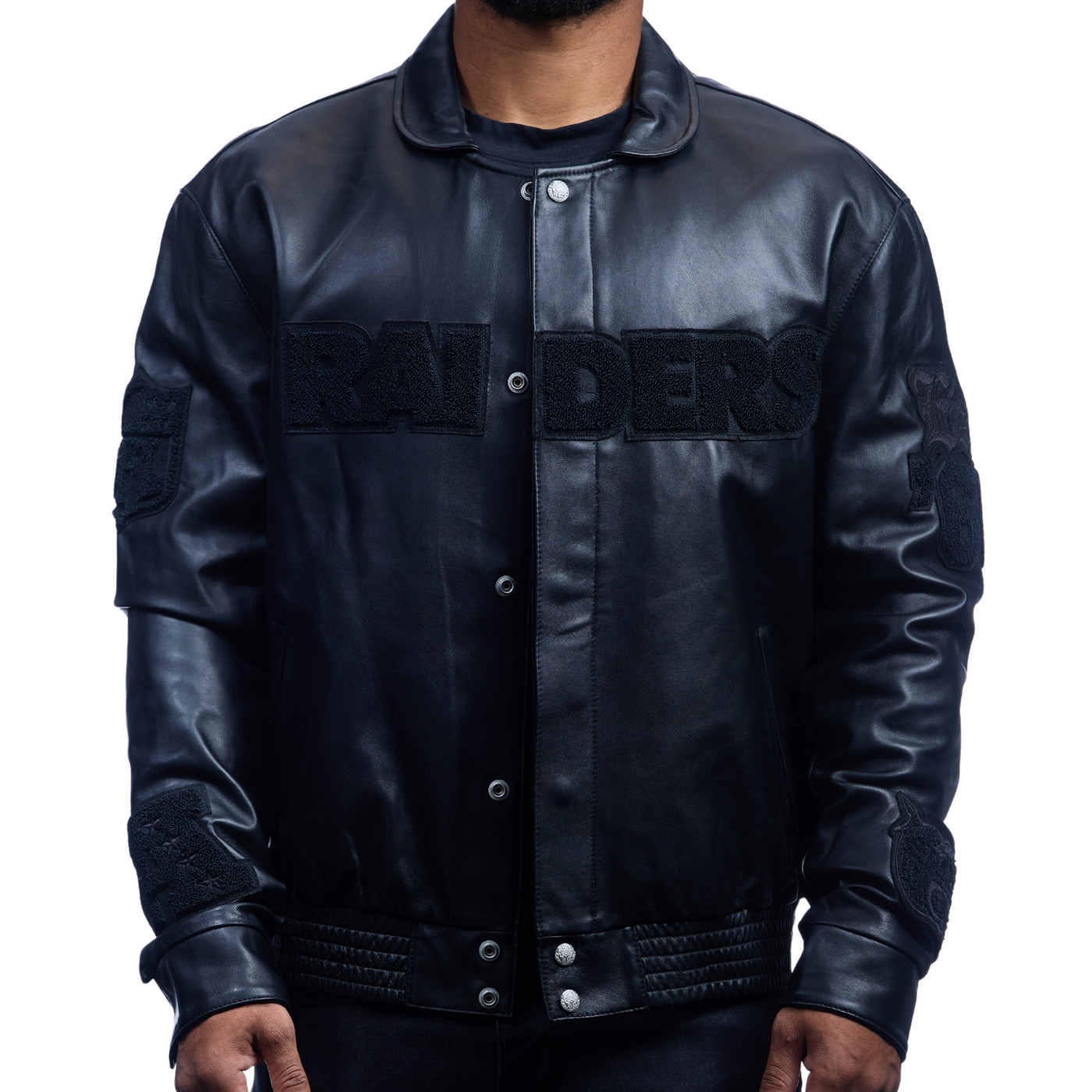 Show off your iconic style in the Jeff Hamilton Raiders Lambskin Leather Tonal Jacket. This full snap jacket is designed with premium leather and has an interior polyester lining, with black tonal chenille team wordmark logo across the front, and tonal team establishment year, AFC Conference, Jeff Hamilton and official league logo appliques on the sleeve, with a large tonal chenille team shield logo applique on the back. The interior lining features an exclusive Jeff Hamilton signature plaque, making this jacket a collector’s essential. 100% leather.