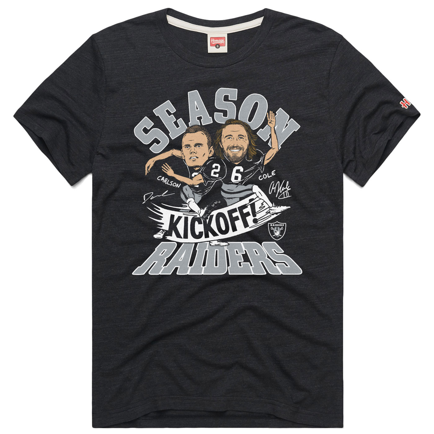 Celebrate Special Teams with the Homage Carlson and Cole Season Kick Off Tee. This heathered unisex tee has a relaxed fit with a hand-drawn kicking and punting graphic featuring Daniel Carlson and AJ Cole, their personal signatures and a team shield logo printed across the body. 50% polyester, 25% cotton, 25% rayon.
