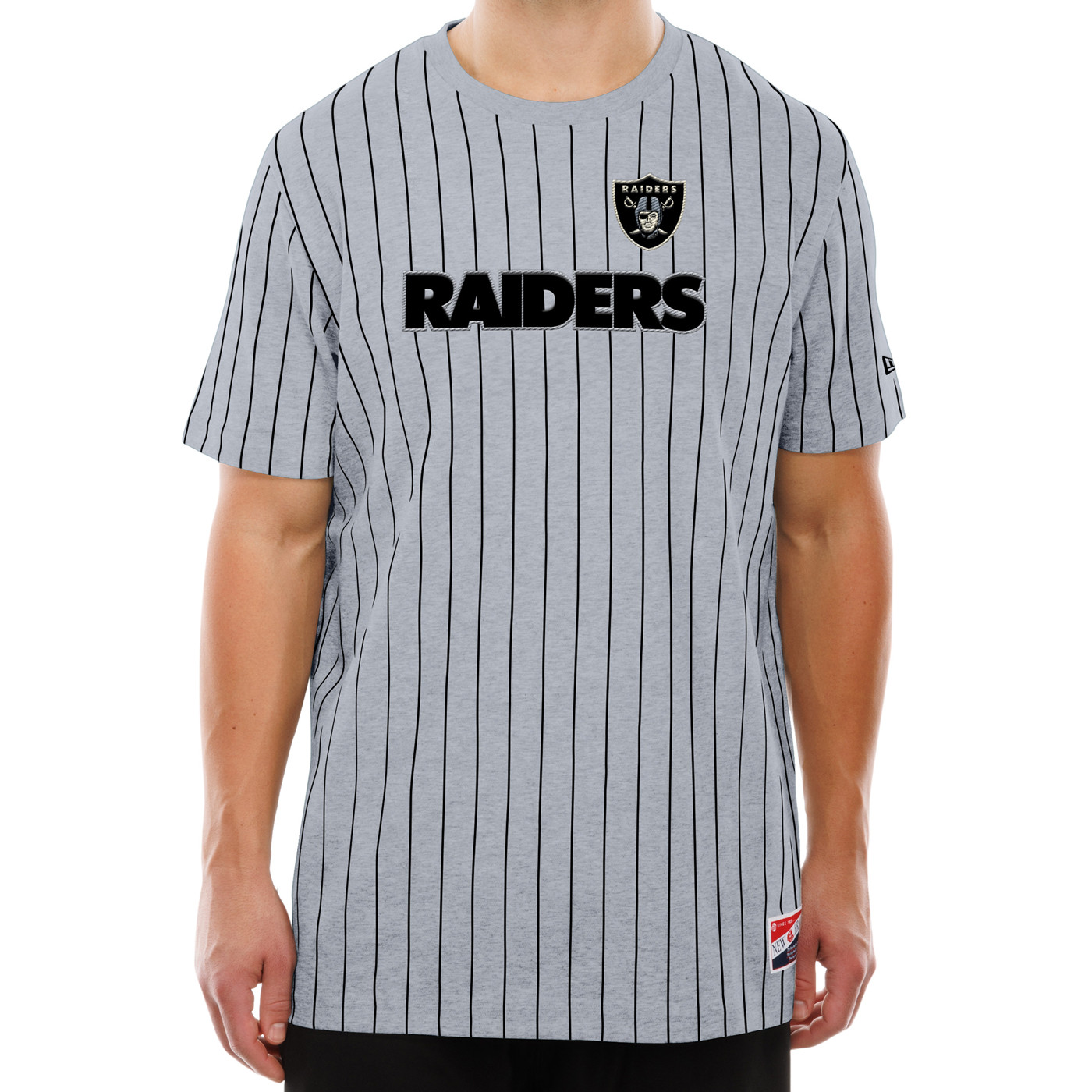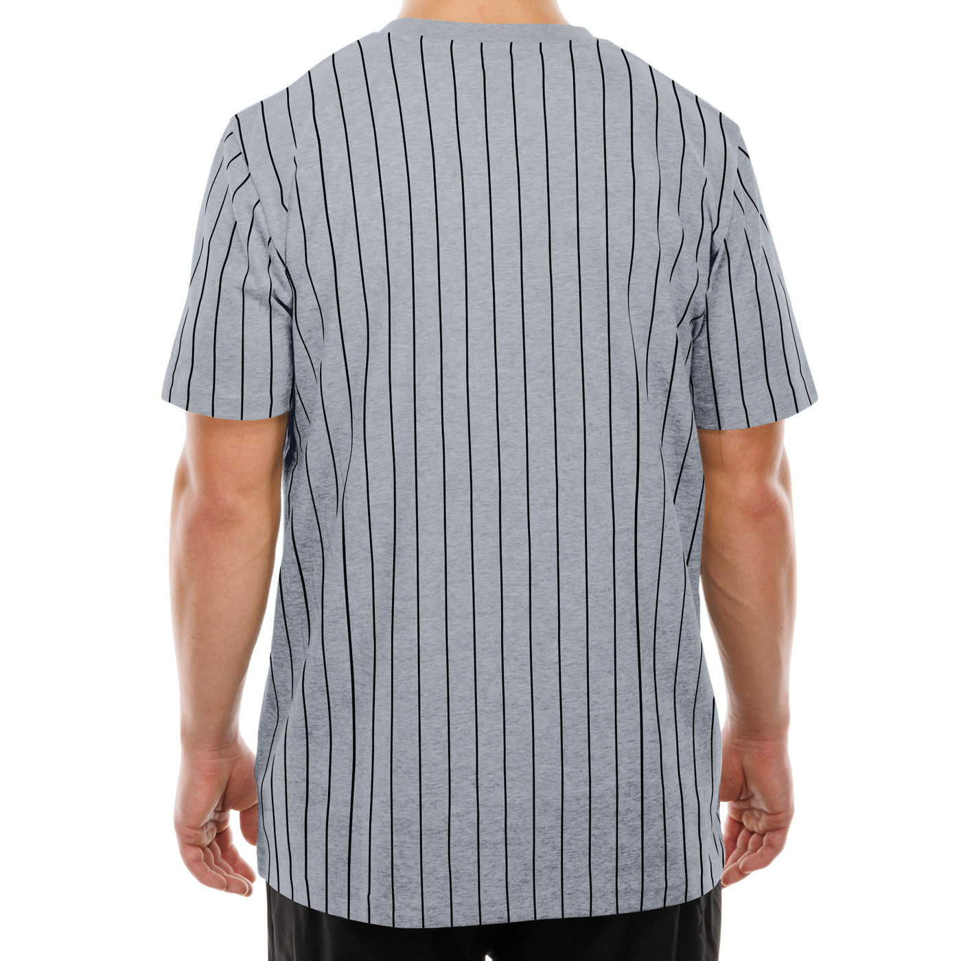 Add a retro edge to your rotation with the New Era Throwback Striped Tee. This relaxed-fit, heathered pinstripe shirt features embroidered team wordmark and team logos on the chest, bringing vintage vibes to your everyday lineup. 63% cotton, 37% polyester.