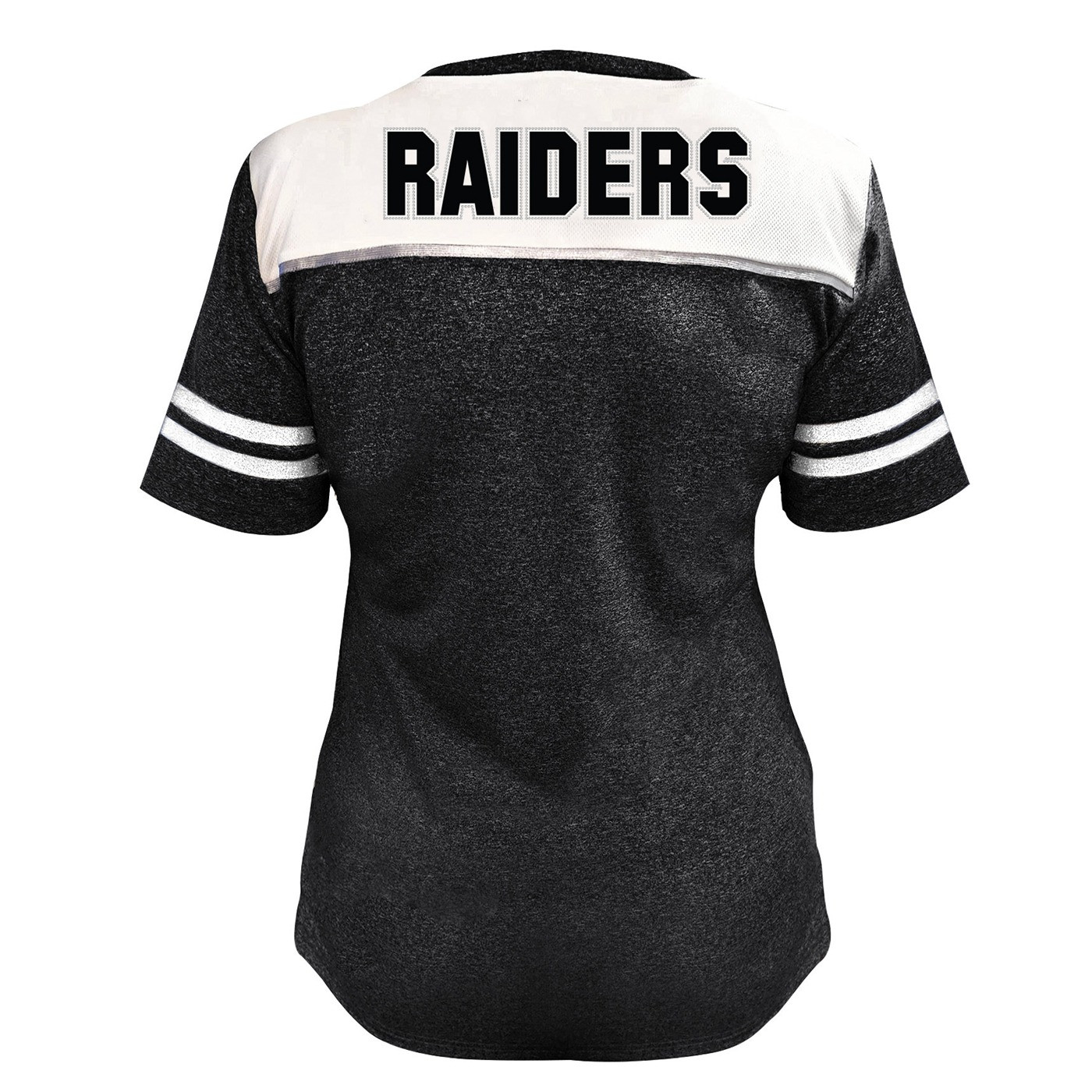 Shine on game day in the Raiders Women's Plus Rhinestone & Glitter V-Neck Tee. Featuring glittery sleeve stripes, contrasting raglan shoulders, rhinestone-outlined “Las Vegas” embroidery with the team shield logo on the front , and rhinestone-outlined "Raiders" on the back, this top brings bold sparkle and comfort to your fan style. 100% polyester.