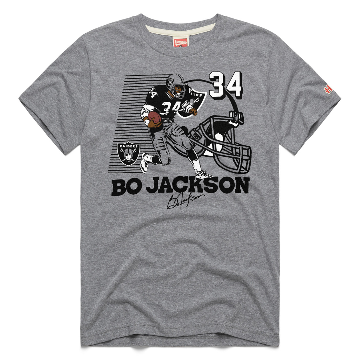 Channel legendary plays with the Homage Bo Jackson Born To Run Illustration Tee. This unisex crewneck tee boasts a detailed, hand-drawn graphic of Bo Jackson in action, paired with the team shield and team helmet logos, with his personal signature printed on the front for a timeless fan tribute. 50% polyester, 25% cotton, 25% rayon.
