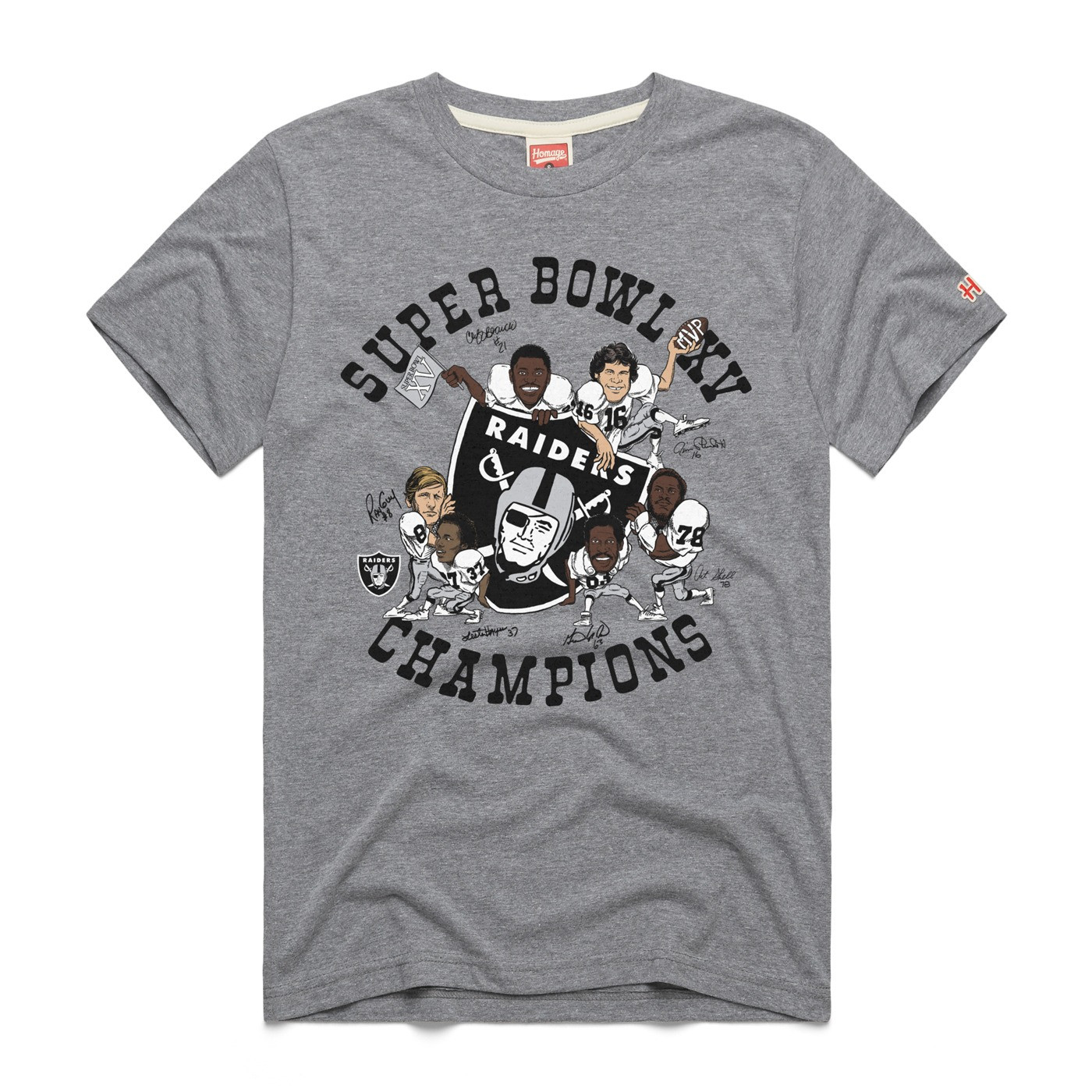 Honor the first wild card team to win it all with the Homage Raiders Super Bowl XV 45th Anniversary Alumni Players Tee. Designed with a soft heathered fabric and relaxed fit, this tee features hand-drawn illustrations of the 1980 roster, their signatures, and the iconic team shield logo. 50% polyester, 25% cotton, 25% rayon.