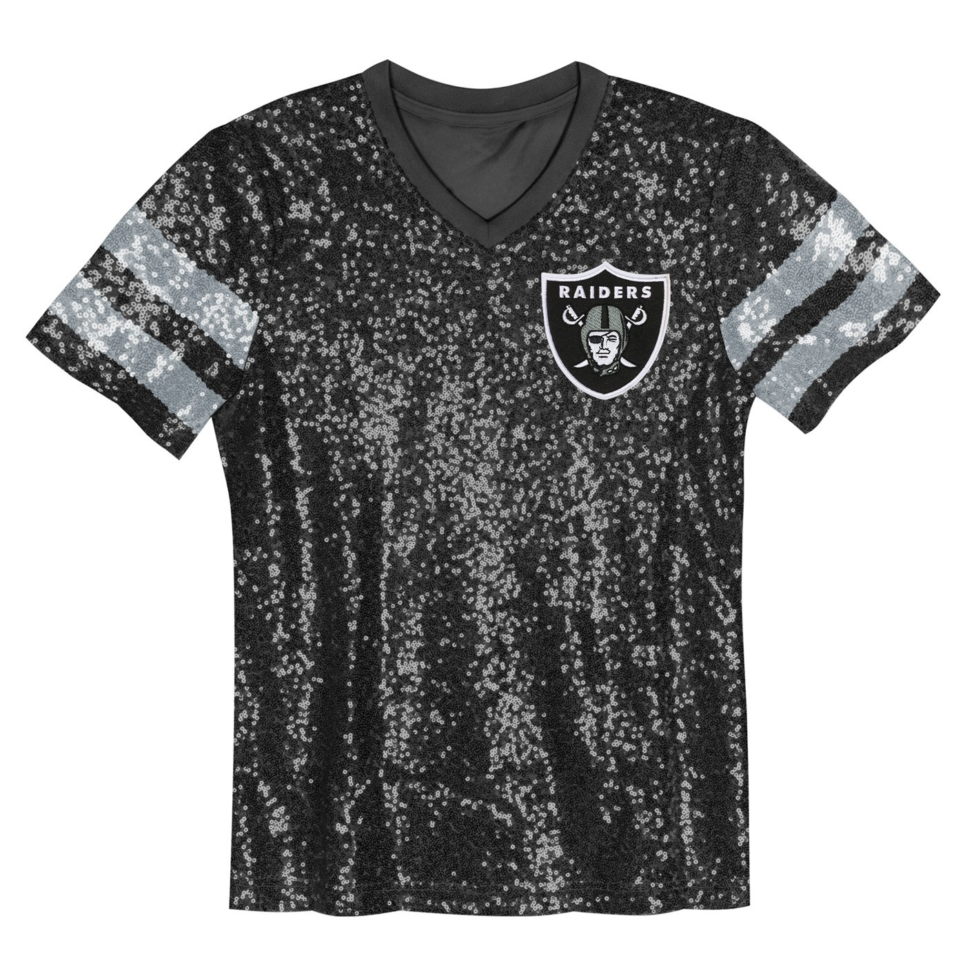 Let your young fan dazzle on game day in the Girls Juvenile Raiders Glam Stripe Sequin Tee from Outerstuff. This V-neck tee is fully covered in shimmering sequins and features an embroidered team shield logo on the left chest, making it a standout piece in any wardrobe. 100% polyester.