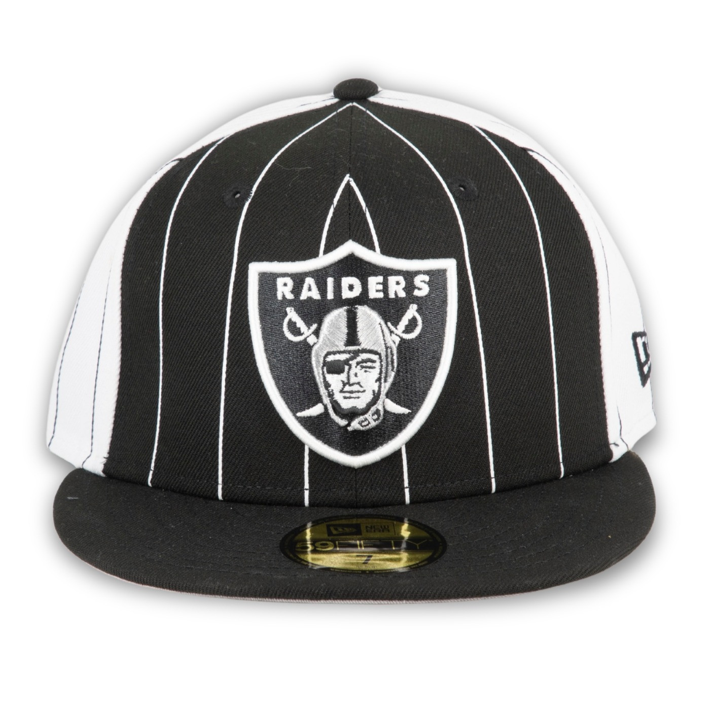 Bring bold energy to the stands in the New Era 59Fifty Raiders Pinstripe Cap. Featuring sleek pinstripes on a split two-tone crown, this fitted cap is finished with a classic gray undervisor and a team shield logo embroidered up front. 100% polyester.