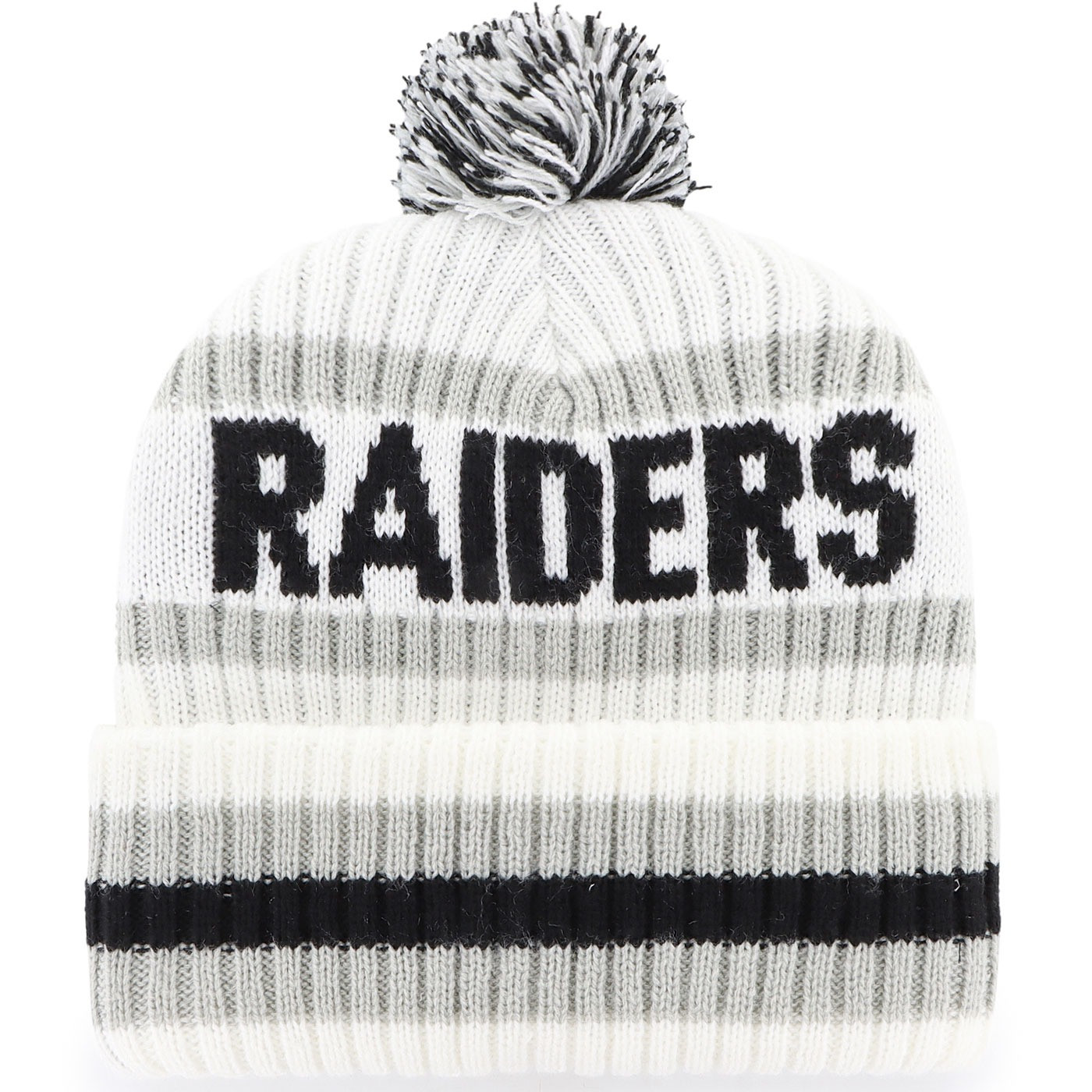 Show off your team spirit in style with the '47 Retro Logo Bering Cuff Knit. This fleece-lined beanie features contrasting stripes, woven Raiders text across the crown, and a contrasting pom on top. An embroidered team 1963 logo on the cuff completes the classic look, making it a must-have for any fan. 100% acrylic.