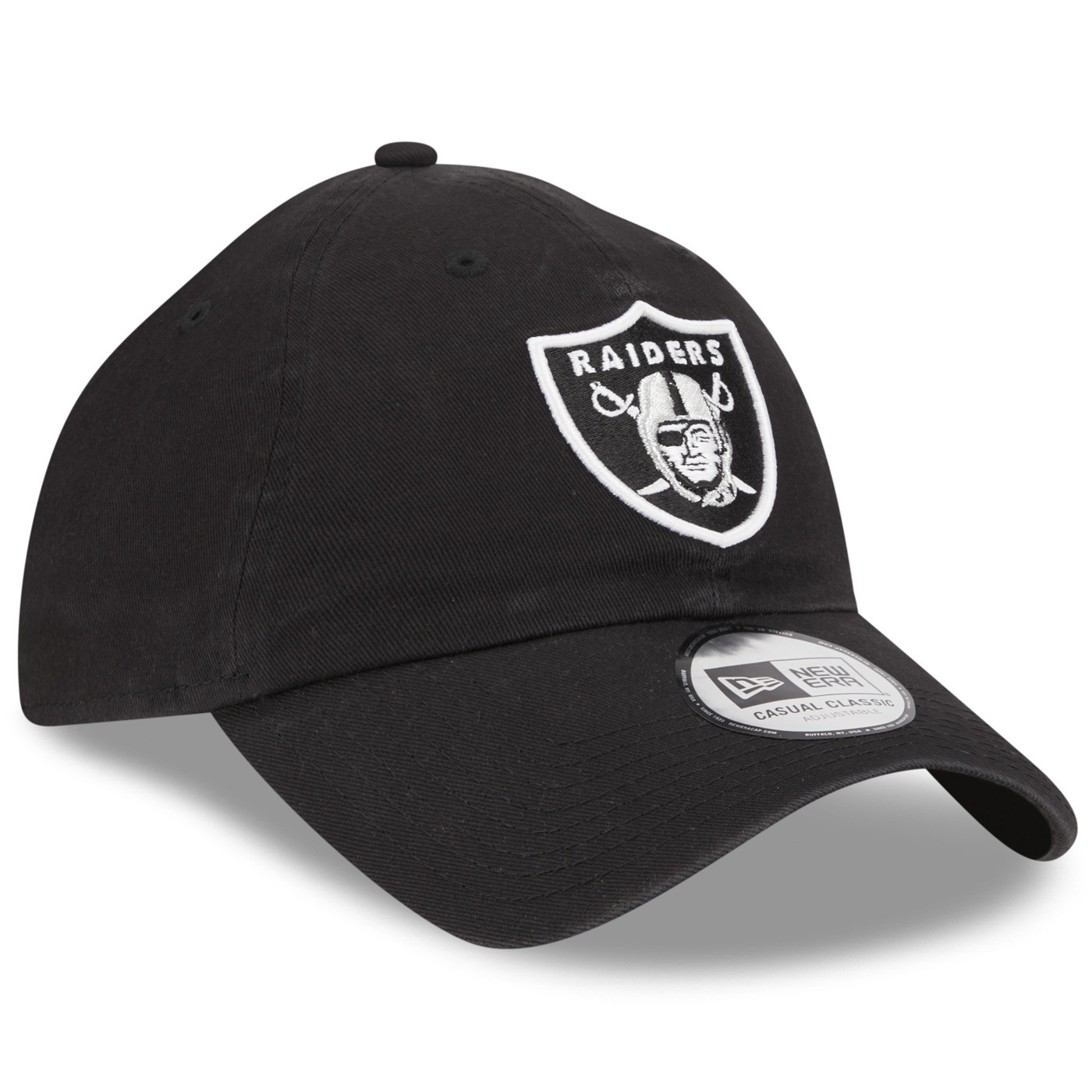Rally behind the Silver and Black in the New Era Raiders 9Forty 4th Down Black Casual Cap. This pre-curved cap is designed with a washed fabrication for a relaxed feel and features an embroidered team shield logo on the front, with an adjustable strap for preferred comfort. 100% cotton.