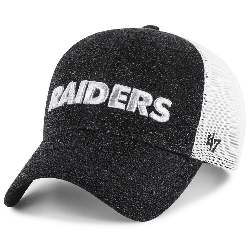 Elevate your game day headwear! The Raiders '47 Encore Mesh MVP Cap is designed with black metallic fabric and contrast-colored hard mesh. This women's trucker cap features raised white team wordmark logo embroidery across the front panels, plus a plastic snapback strap and flat team shield logo embroidery at the rear.